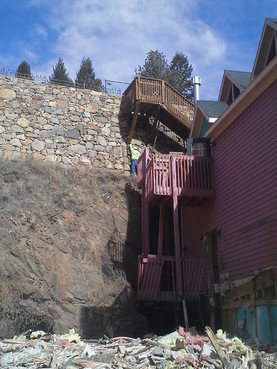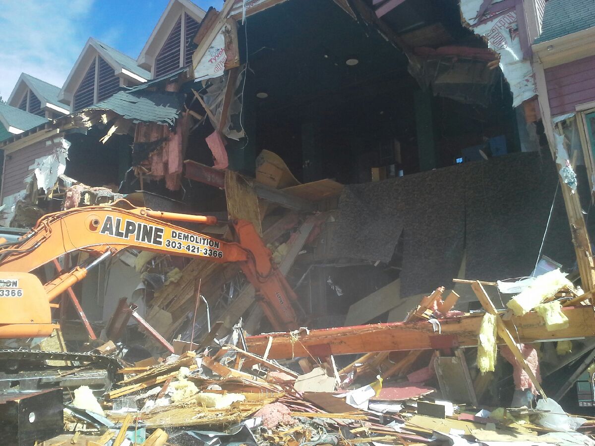 Alpine Demolition was hired to do the demolition, transportation, disposal, and recycling of a two-story light frame structure and multiple earths retaining structures in Black Hawk, CO. The structures were demolished using one ore more heavy “track-hoe” excavators capable of reaching structure elements to be demolished. Excavators were equipped at times with buckets/grapples, hydraulically actuated demolition hammers or shears, and other custom extensions. Excavators were also used to provide temporary stability for other components to prevent unwanted movement.
