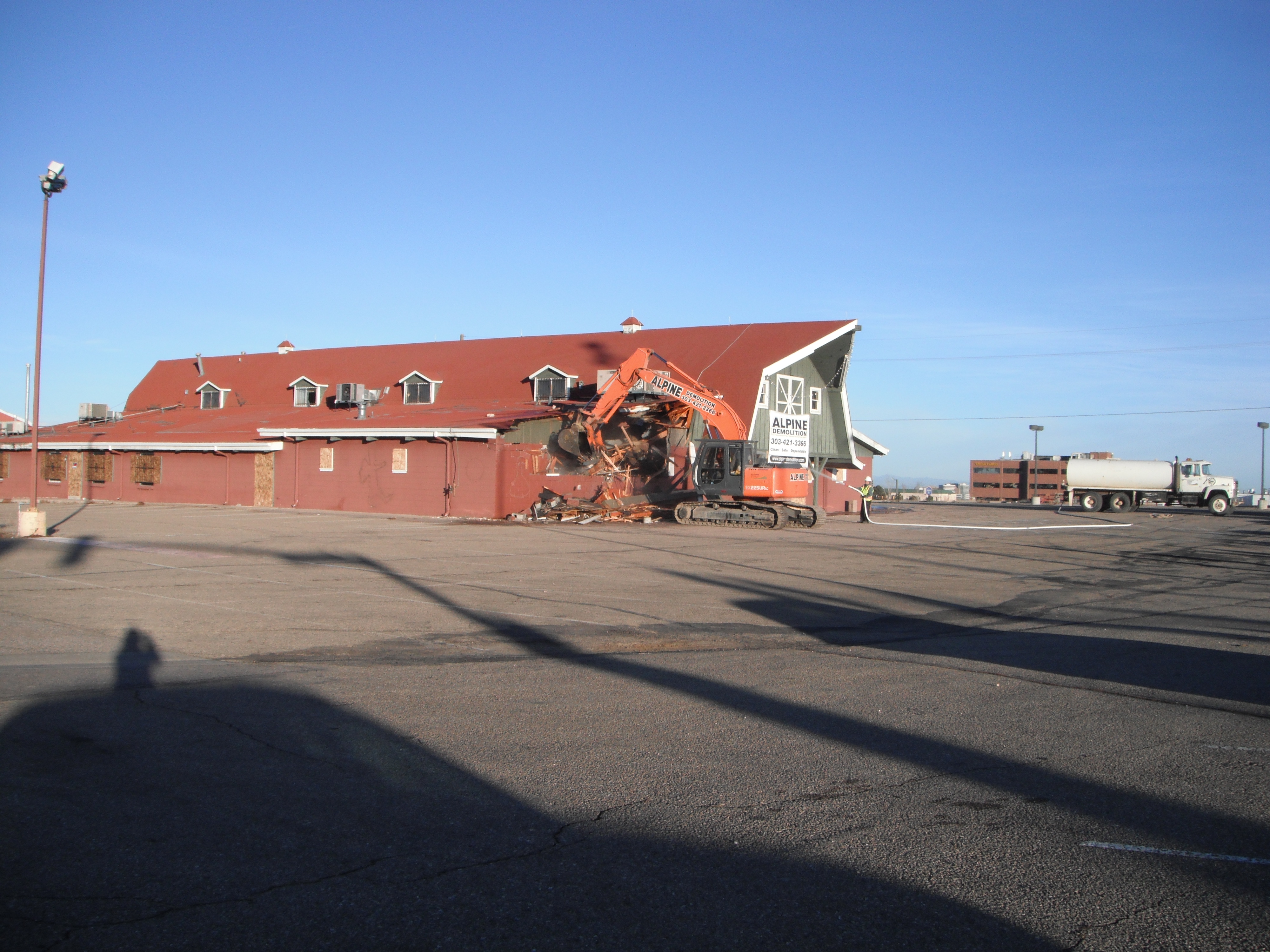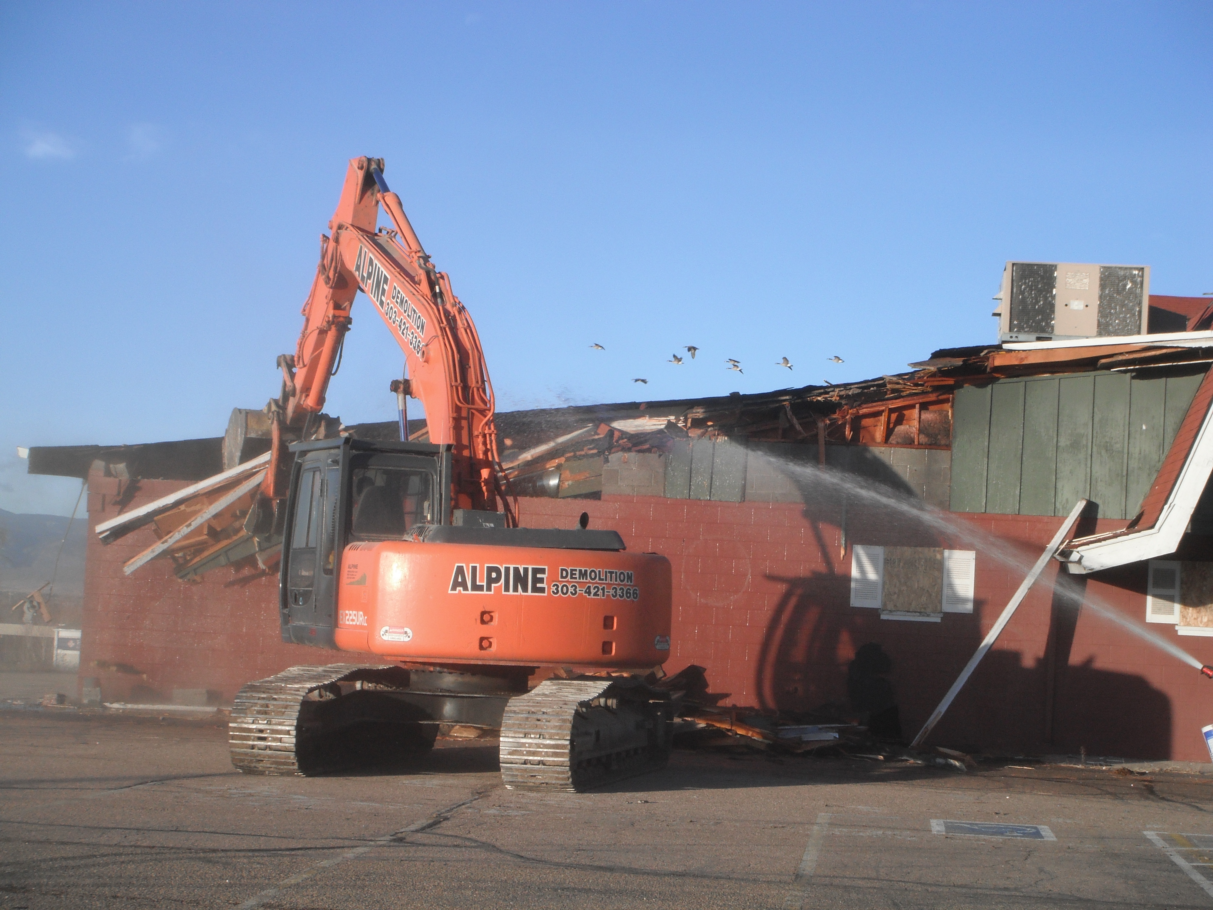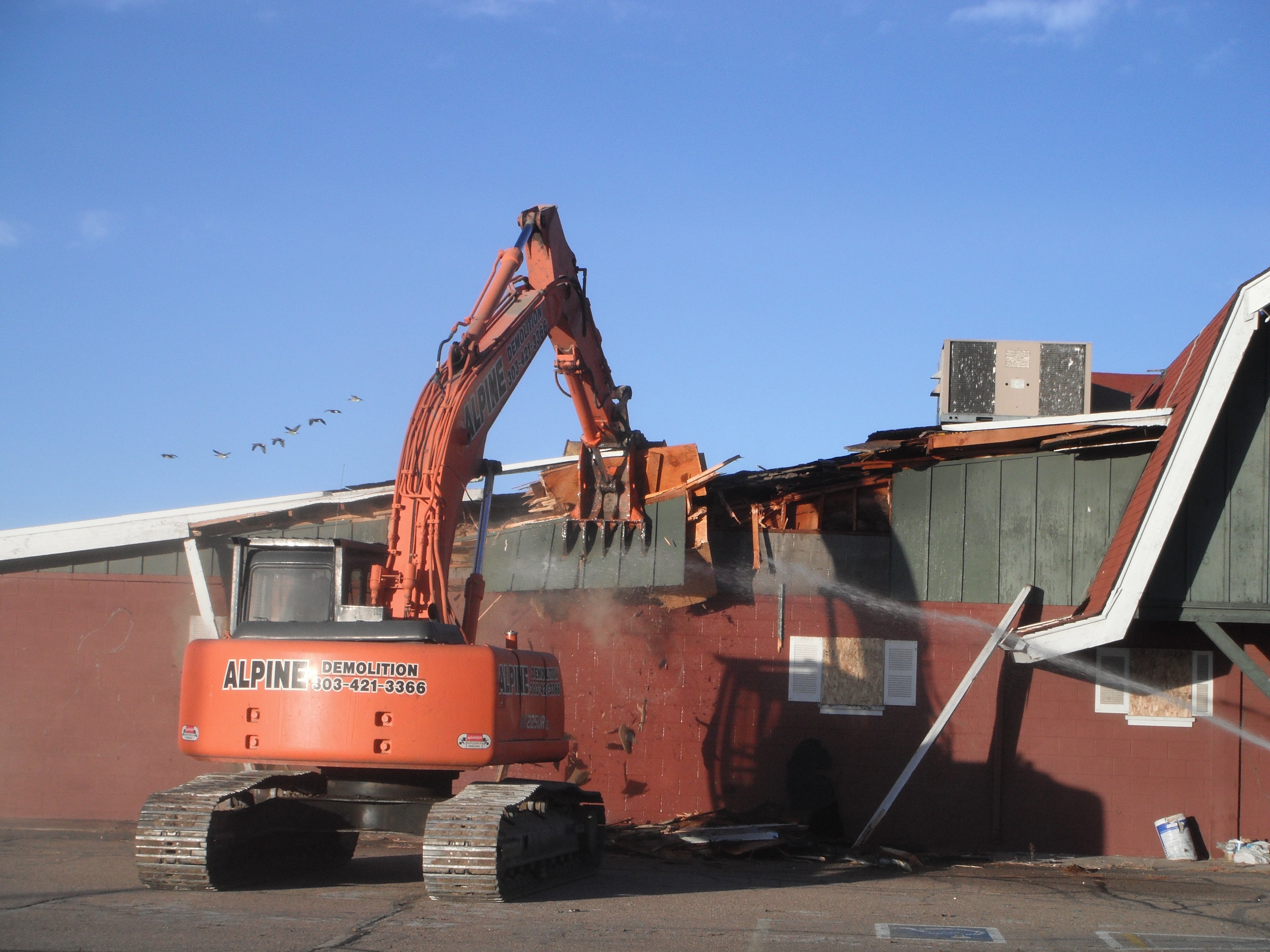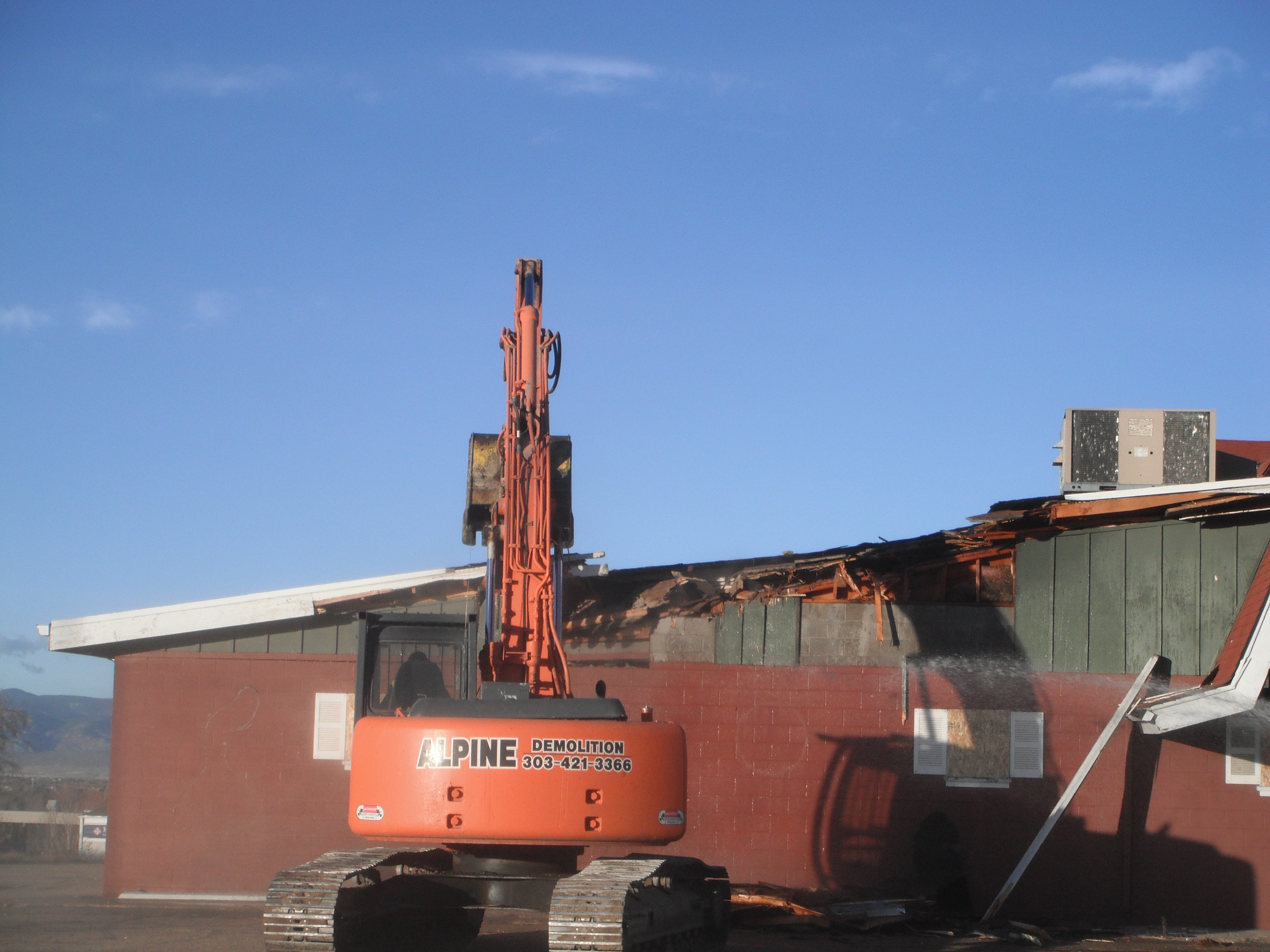 Alpine Demolition was hired to do the demolition of the former Country Dinner Playhouse located in Longmont, Colorado. The Playhouse was once the longest running dinner theater in the State of Colorado. Alpine Demolition worked through snow and high winds to meet the client’s schedule and finished on time and within budget.