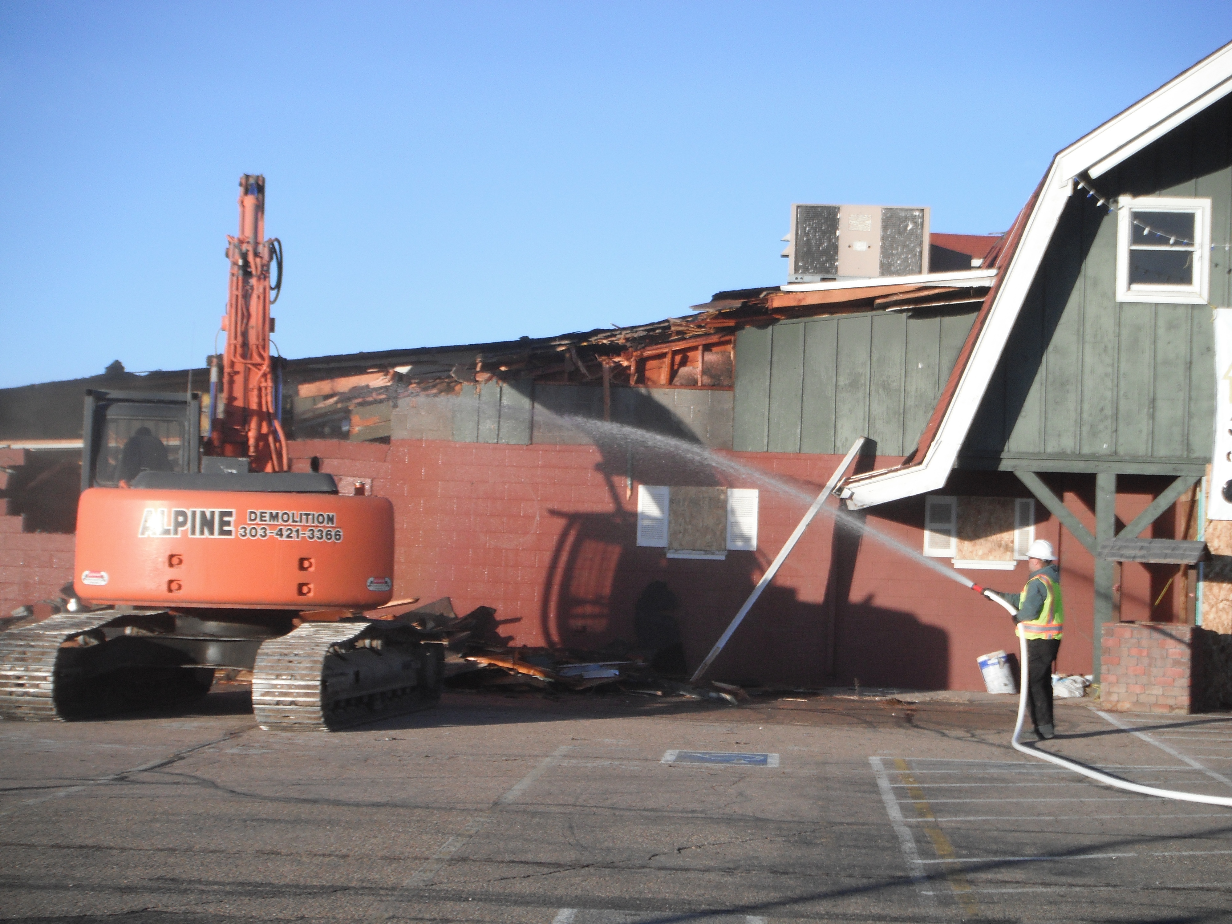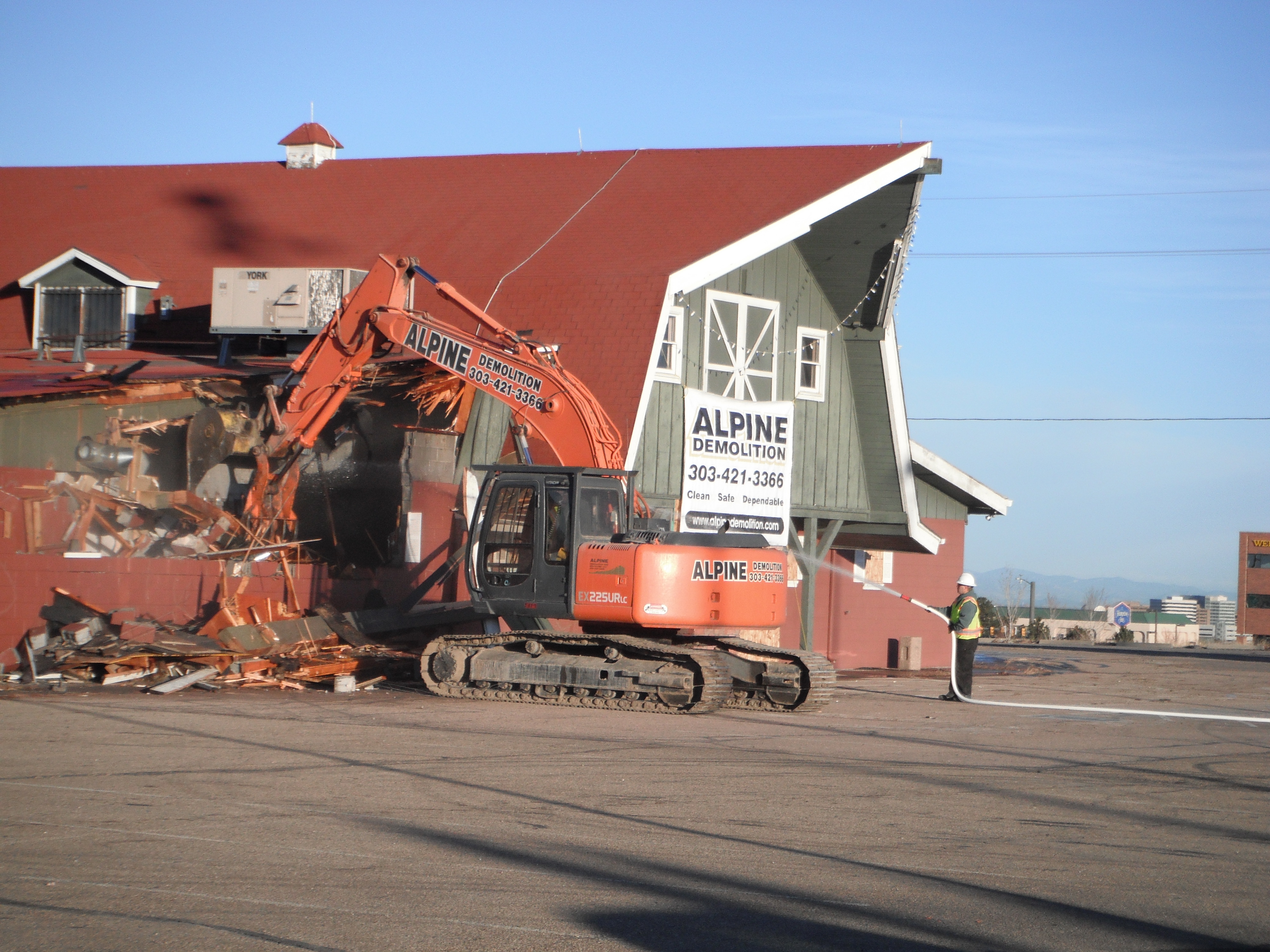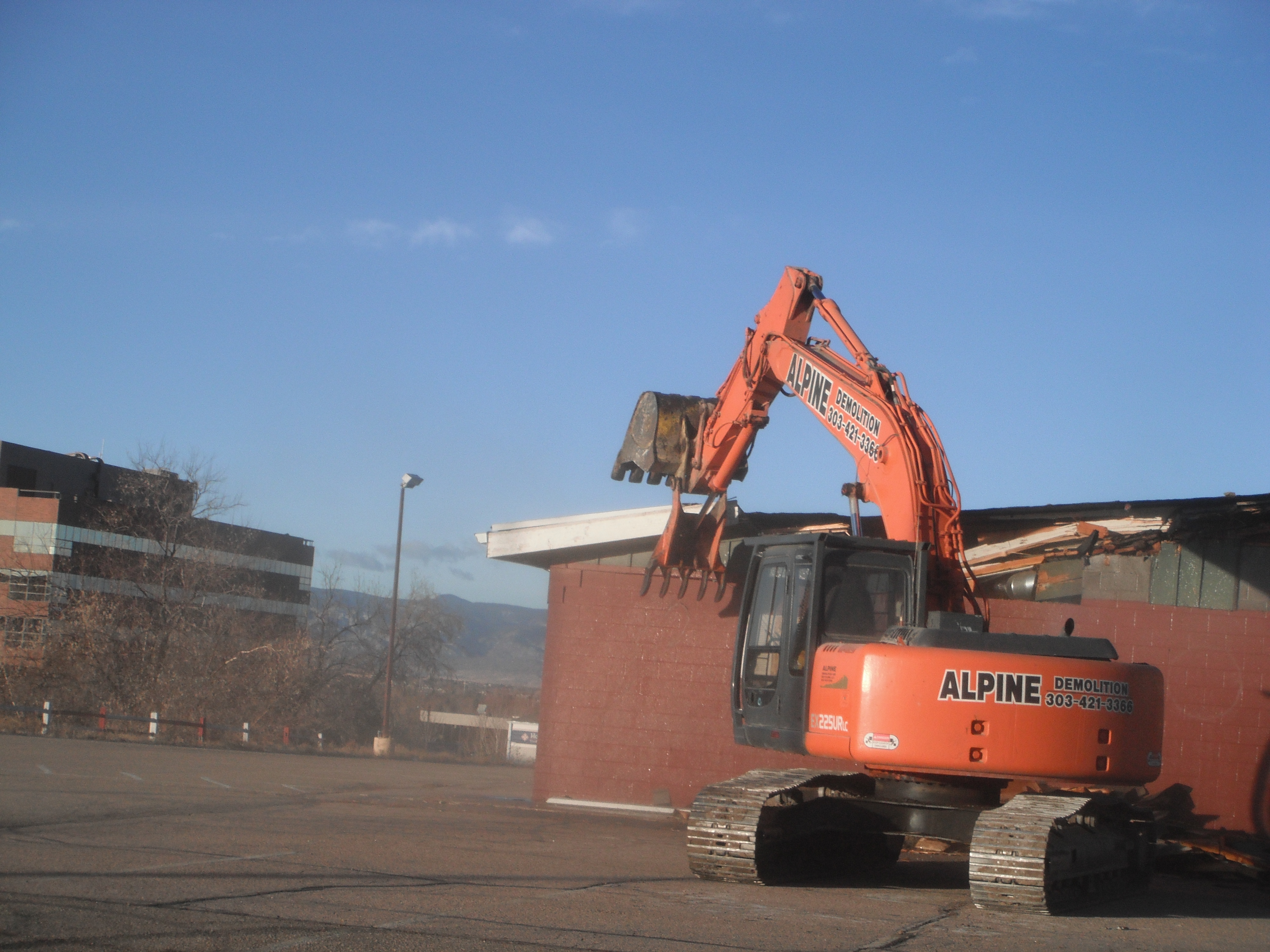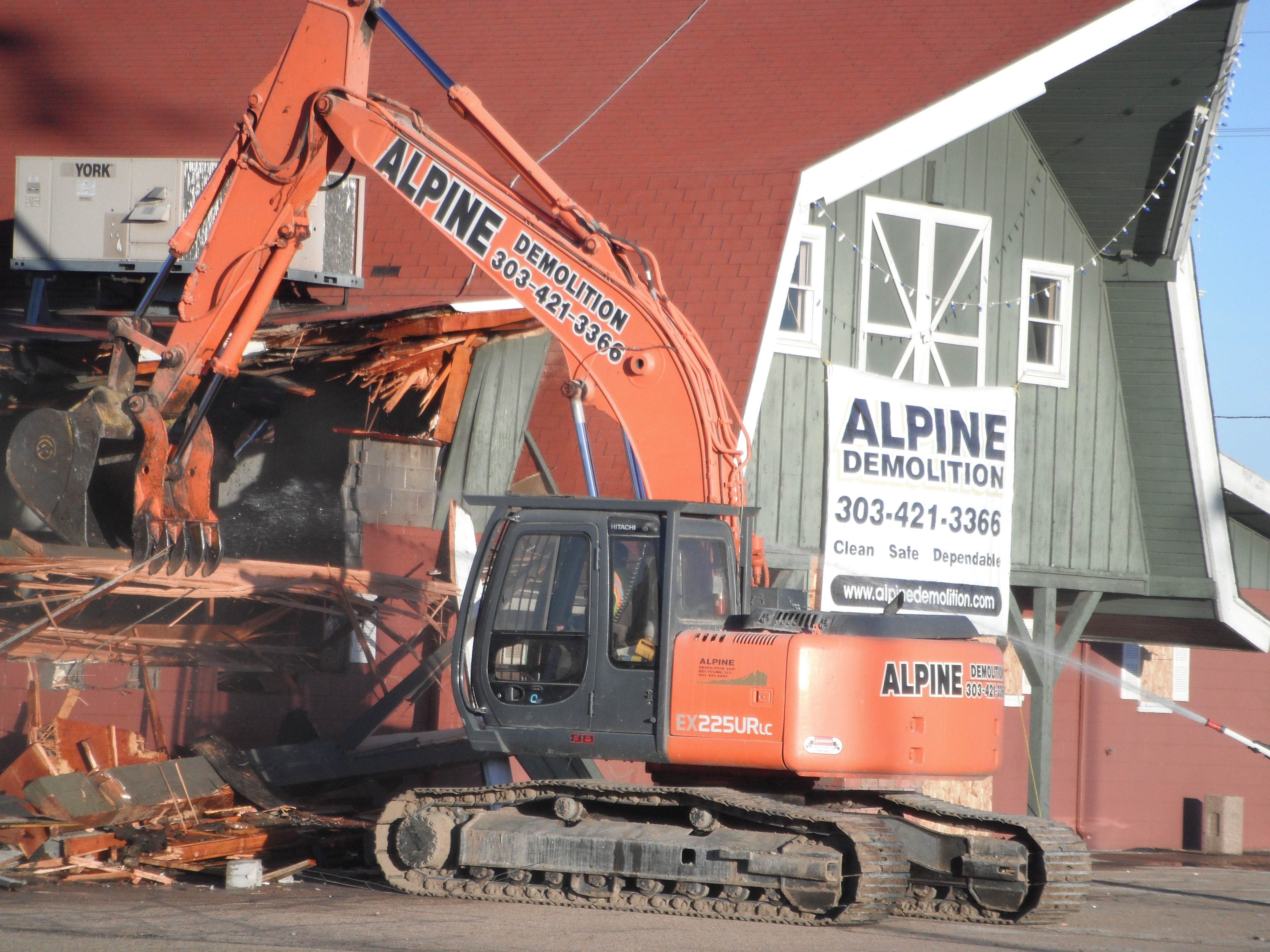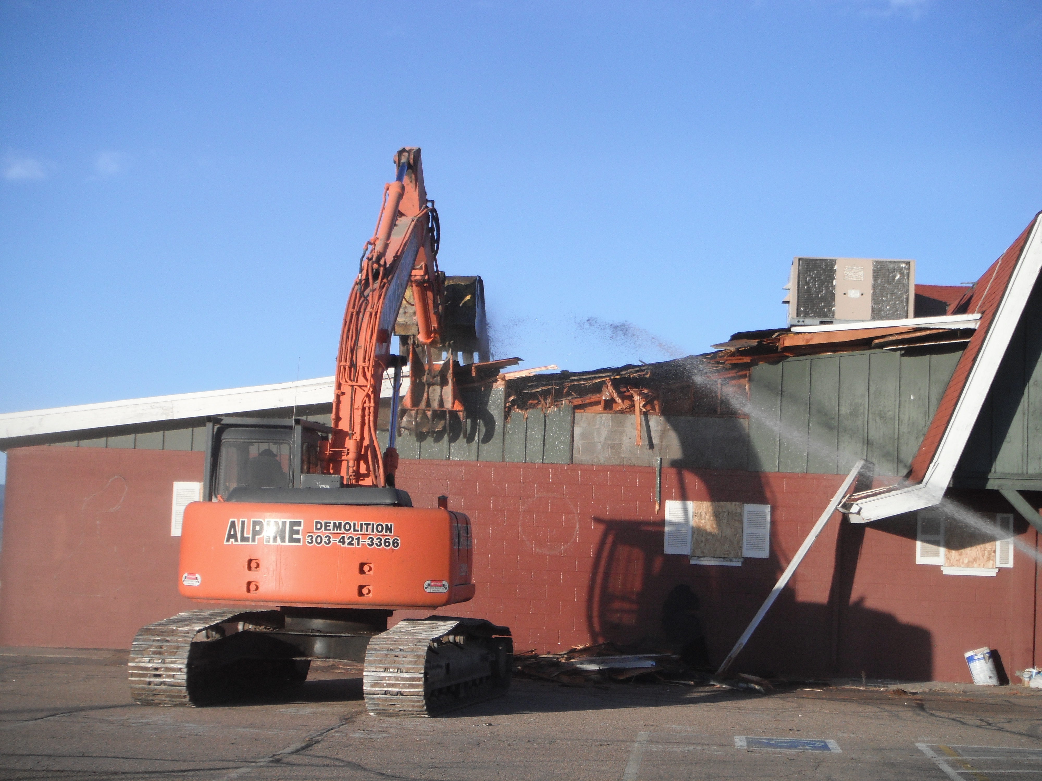 Alpine Demolition was hired to do the demolition of the former Country Dinner Playhouse located in Longmont, Colorado. The Playhouse was once the longest running dinner theater in the State of Colorado. Alpine Demolition worked through snow and high winds to meet the client’s schedule and finished on time and within budget.