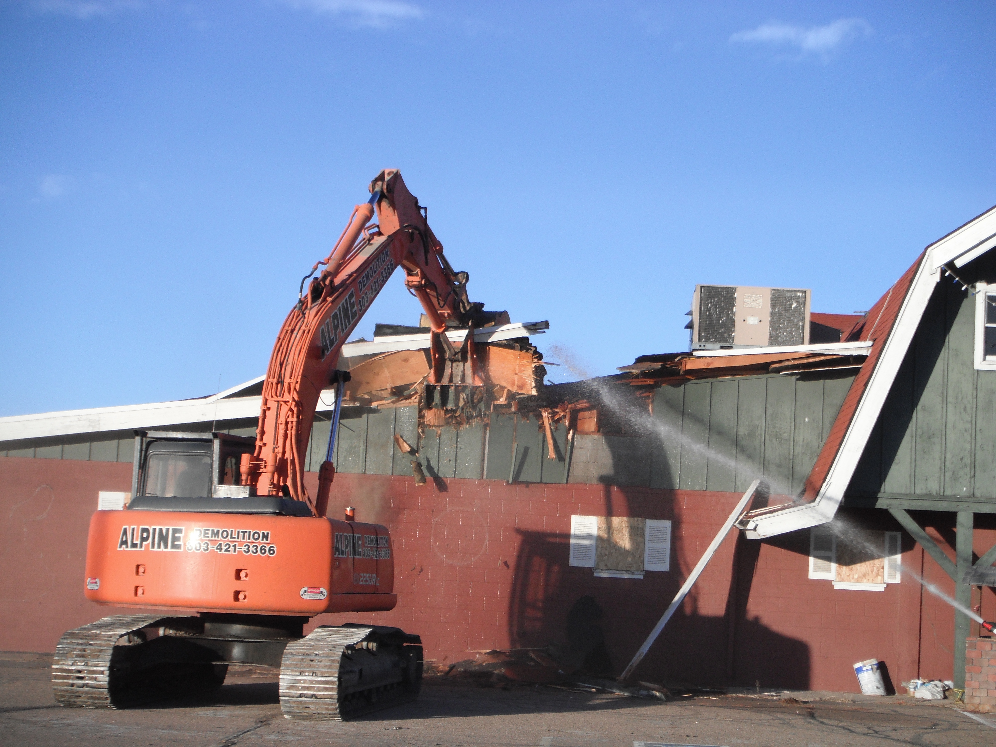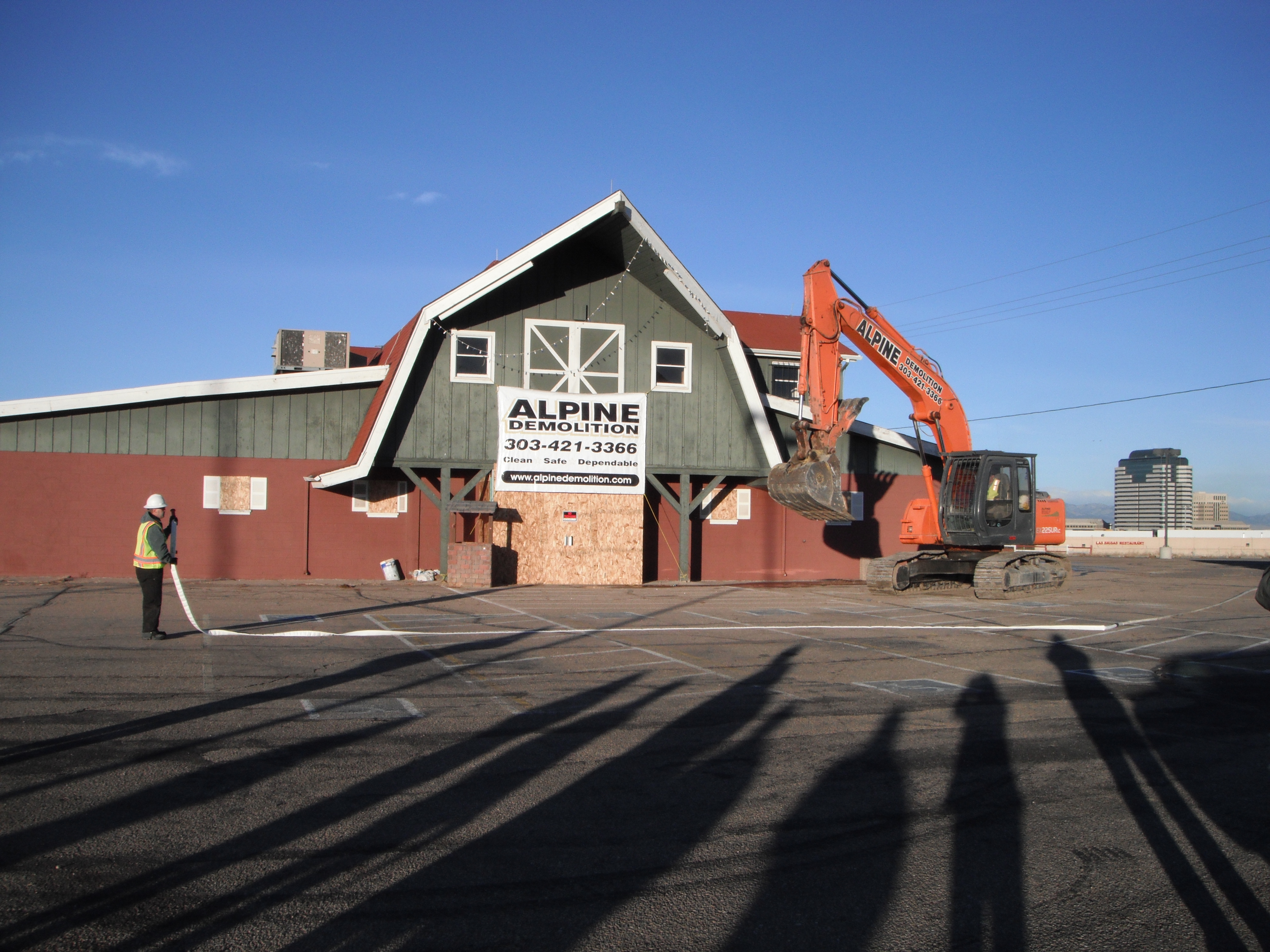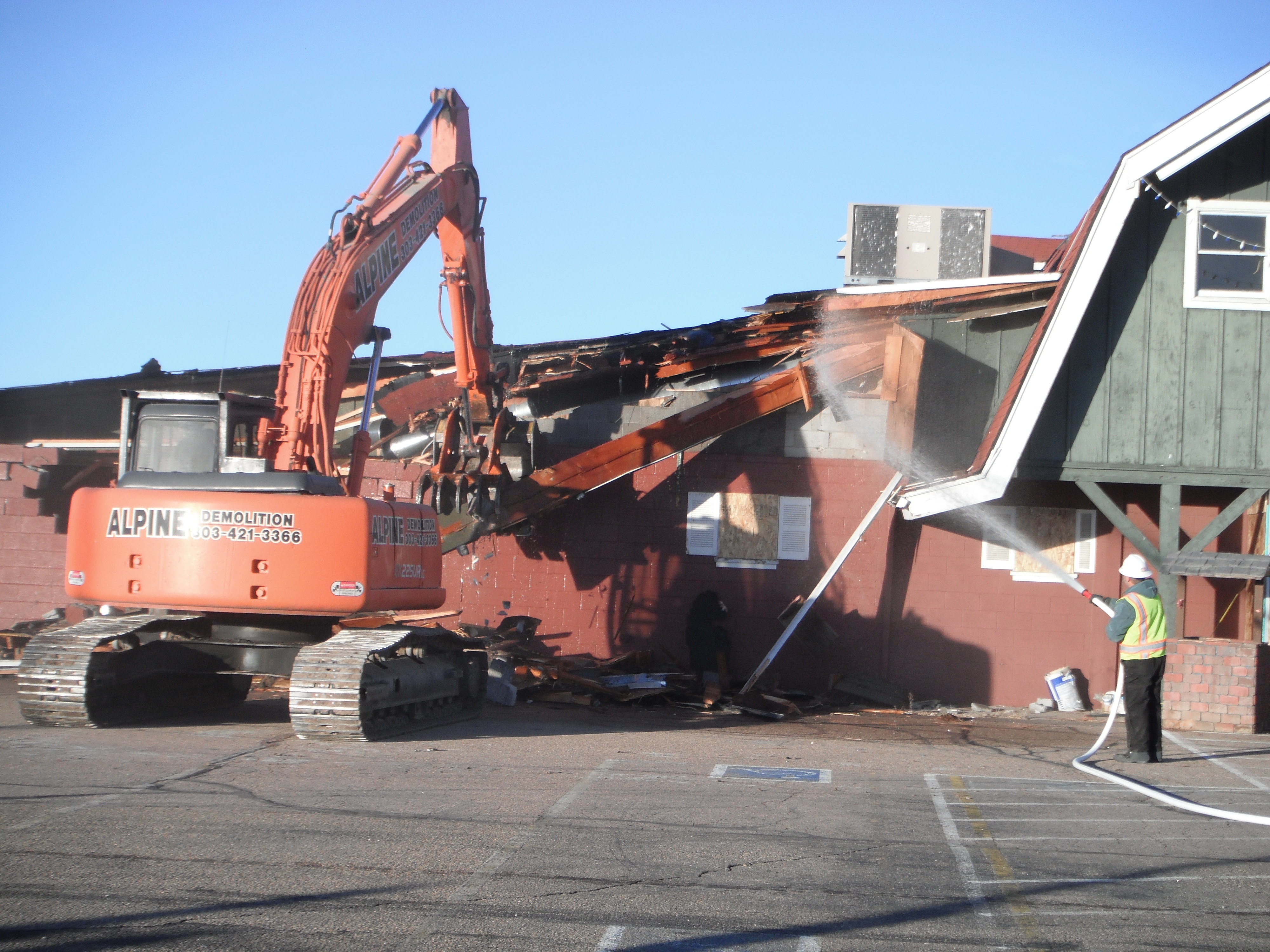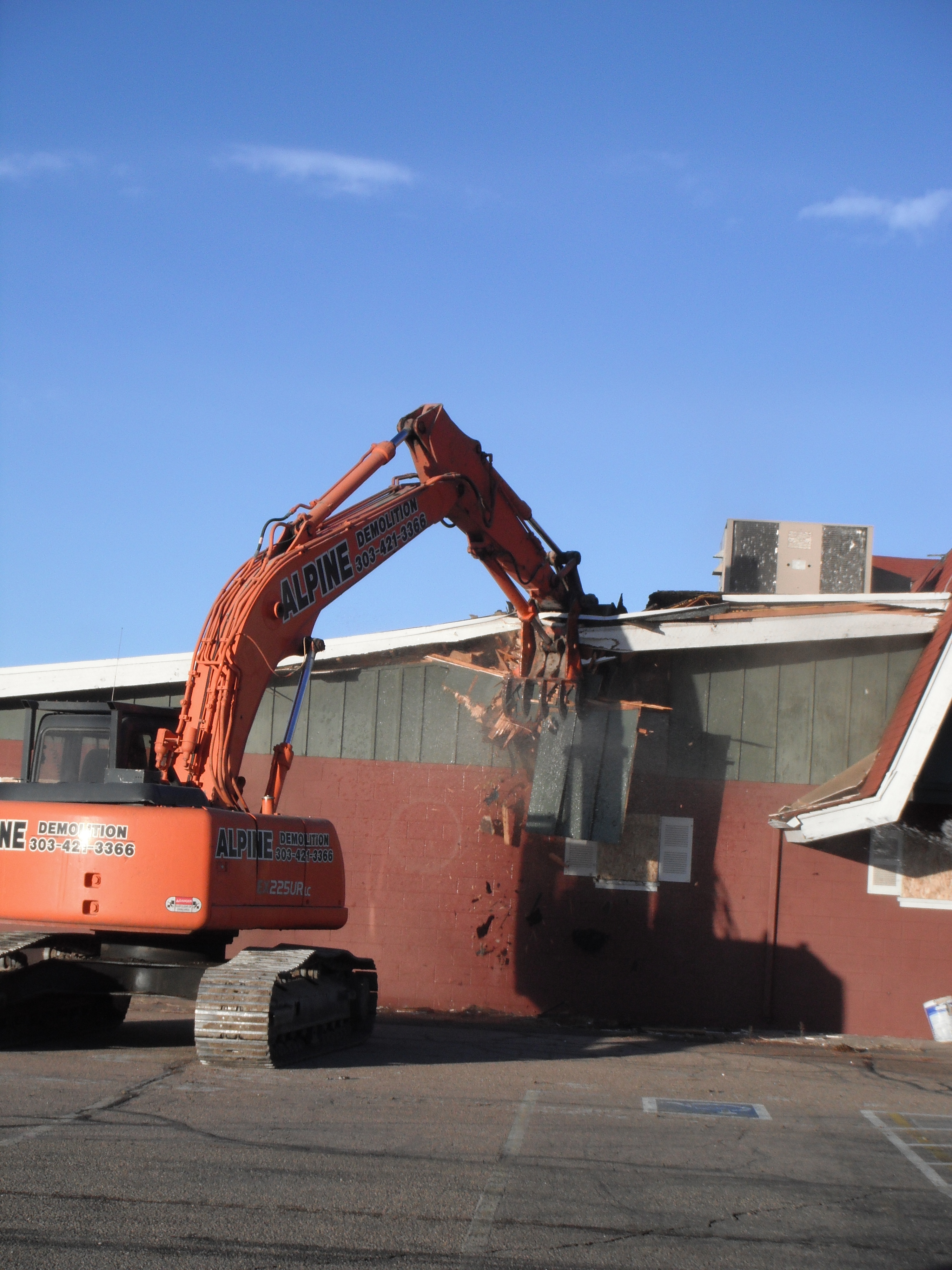 Alpine Demolition was hired to do the demolition of the former Country Dinner Playhouse located in Longmont, Colorado. The Playhouse was once the longest running dinner theater in the State of Colorado. Alpine Demolition worked through snow and high winds to meet the client’s schedule and finished on time and within budget.