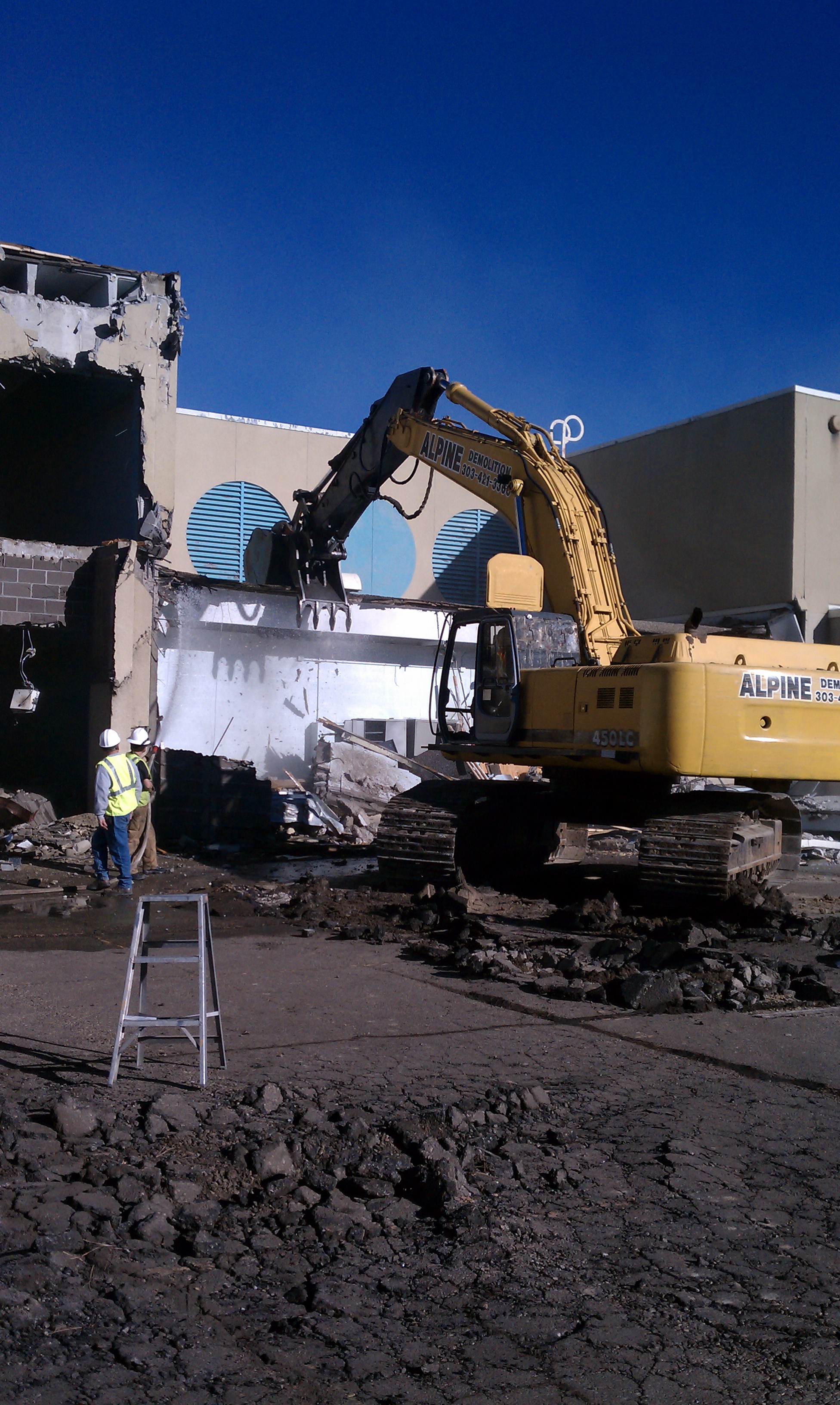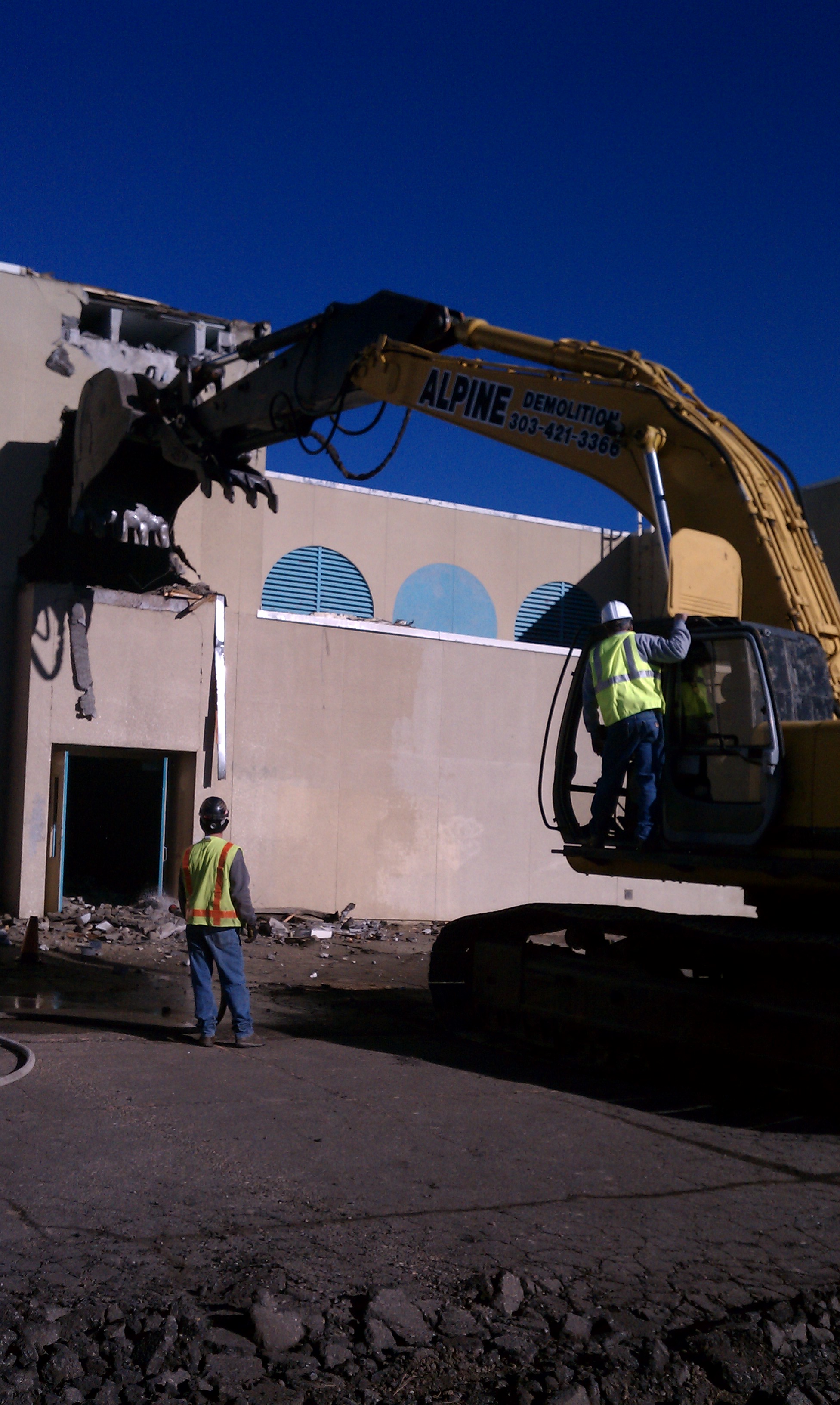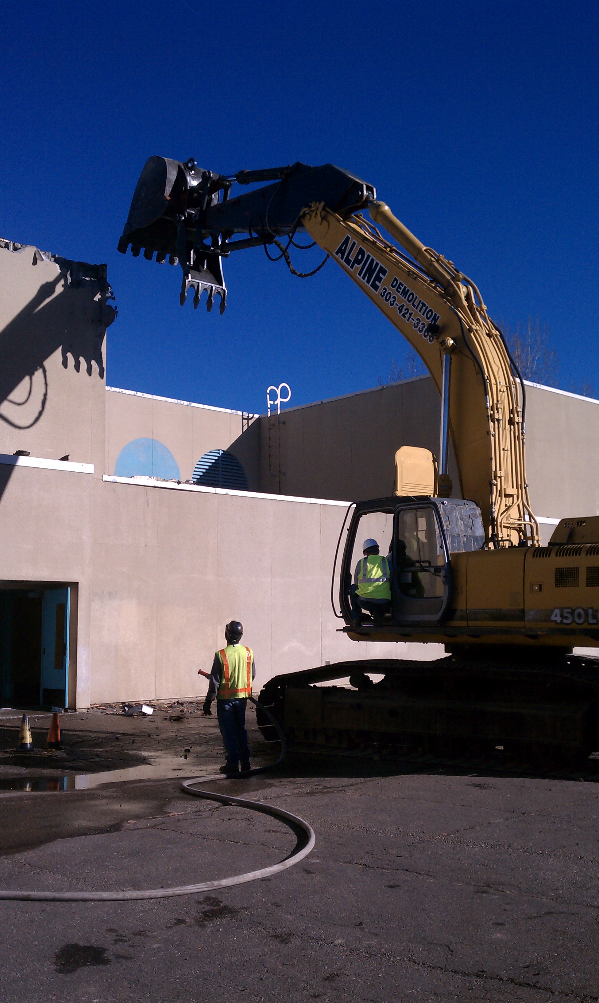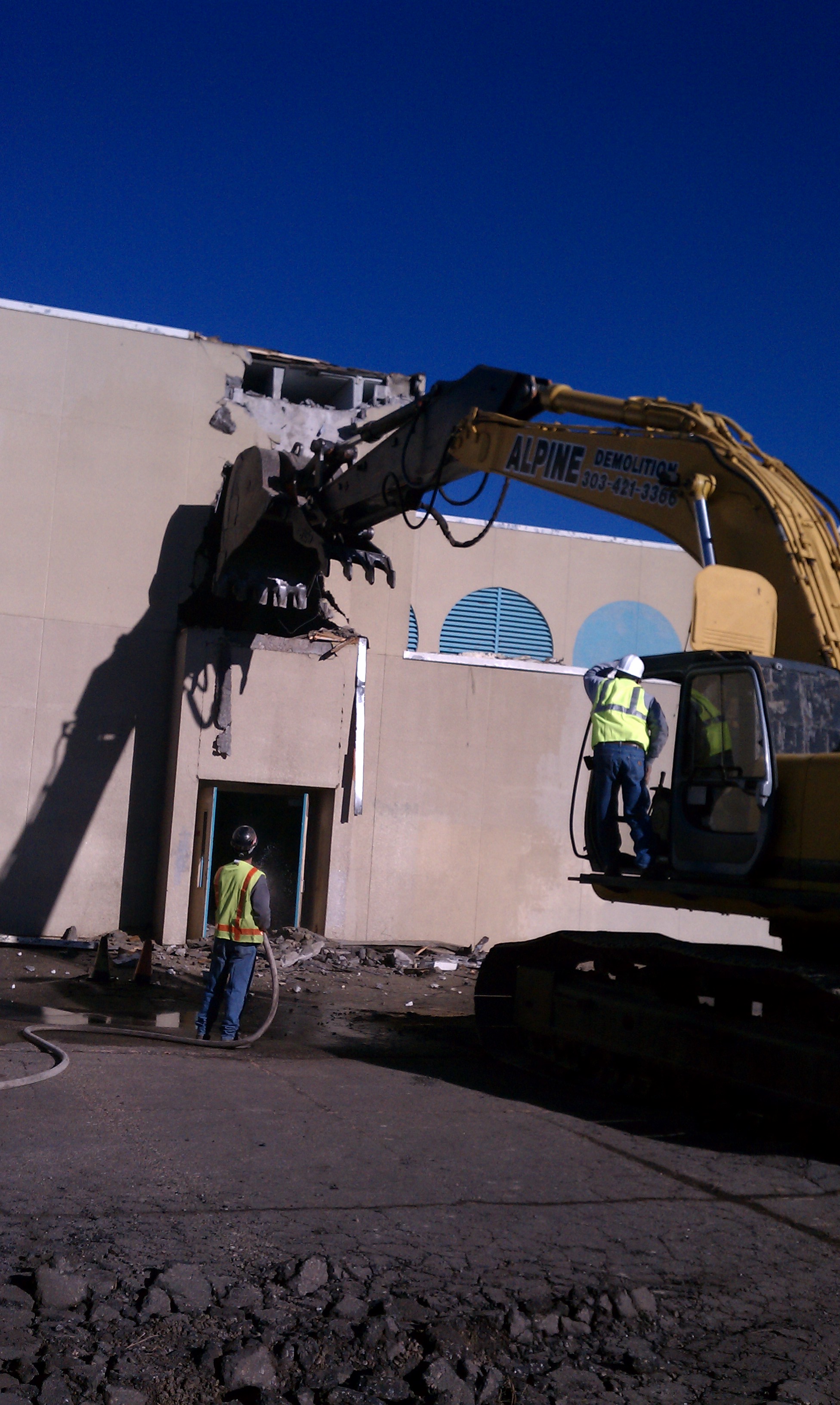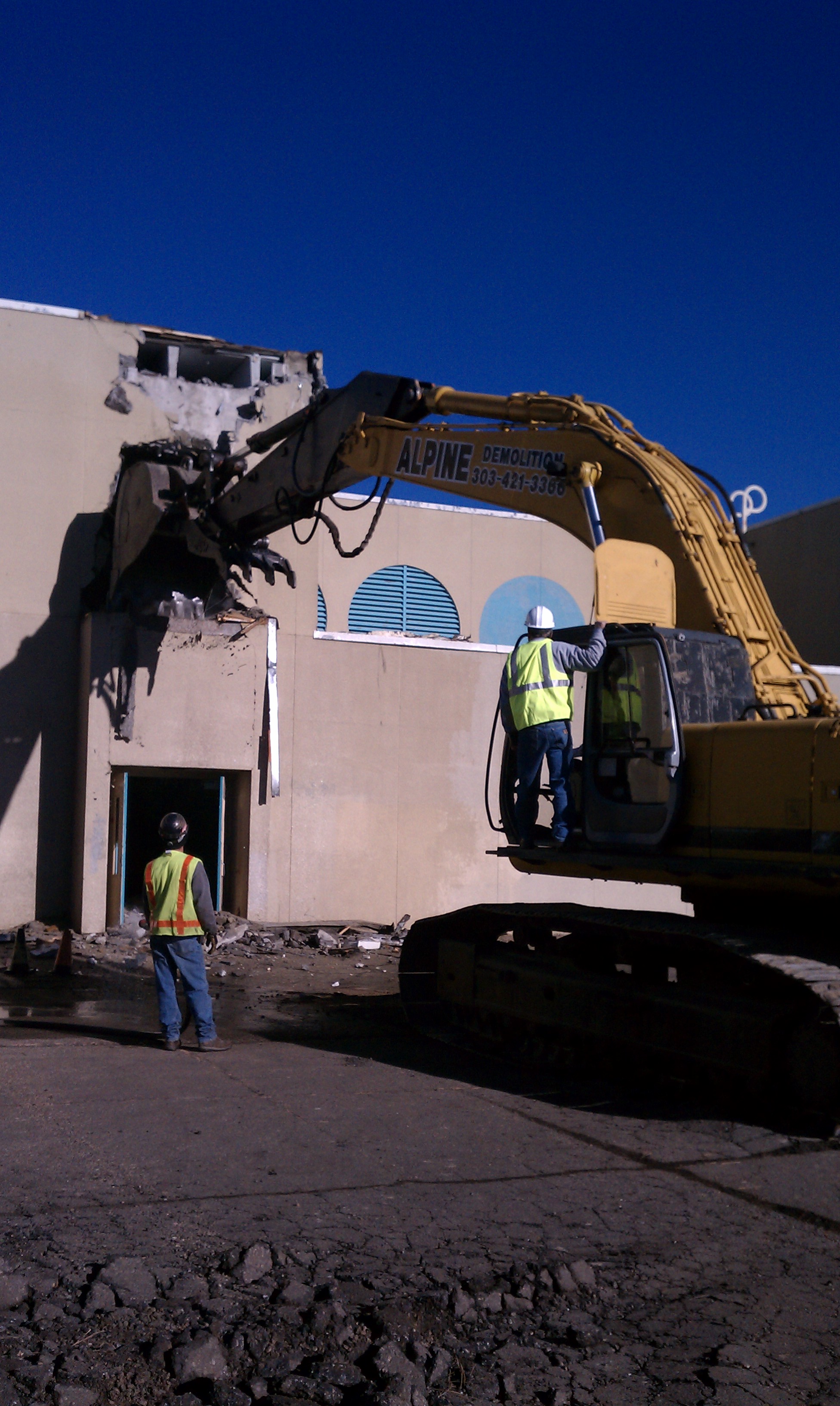 Alpine Demolition was hired to do the demolition of the former Gove Middle School located between two major intersections in Denver, Colorado. Alpine was contracted byNational Jewish Hospital to perform the demolition so they can expand it to a parking area. Within our scope of work, we also need to do the removal of a pedestrian bridge which crosses Colorado Blvd. Alpine removed the bridge in the middle of the night and had to close Colorado Blvd down for four hours. Alpine reached a recycling rate of 80% on this project and encountered many weather delays due to high winds and snow.