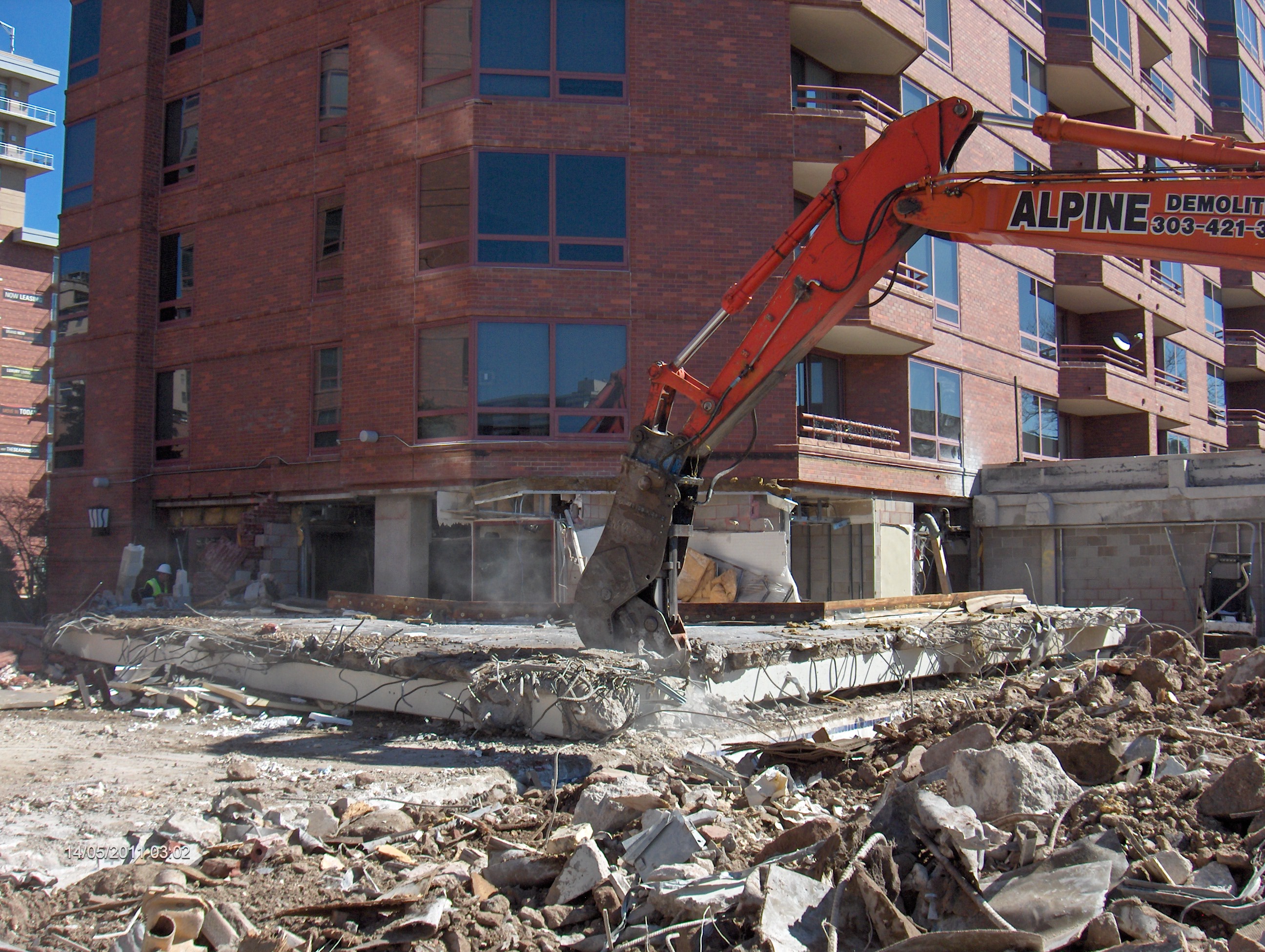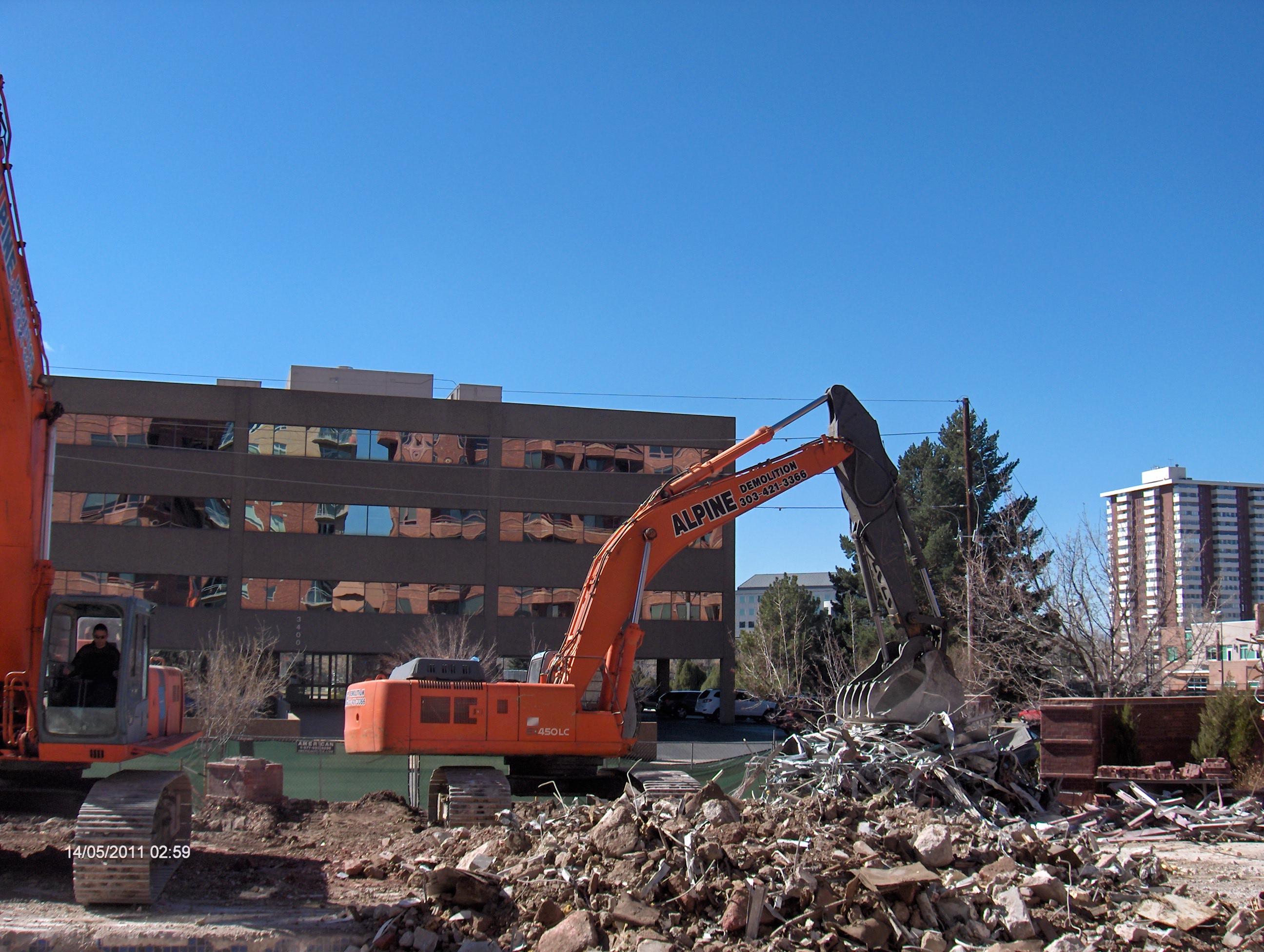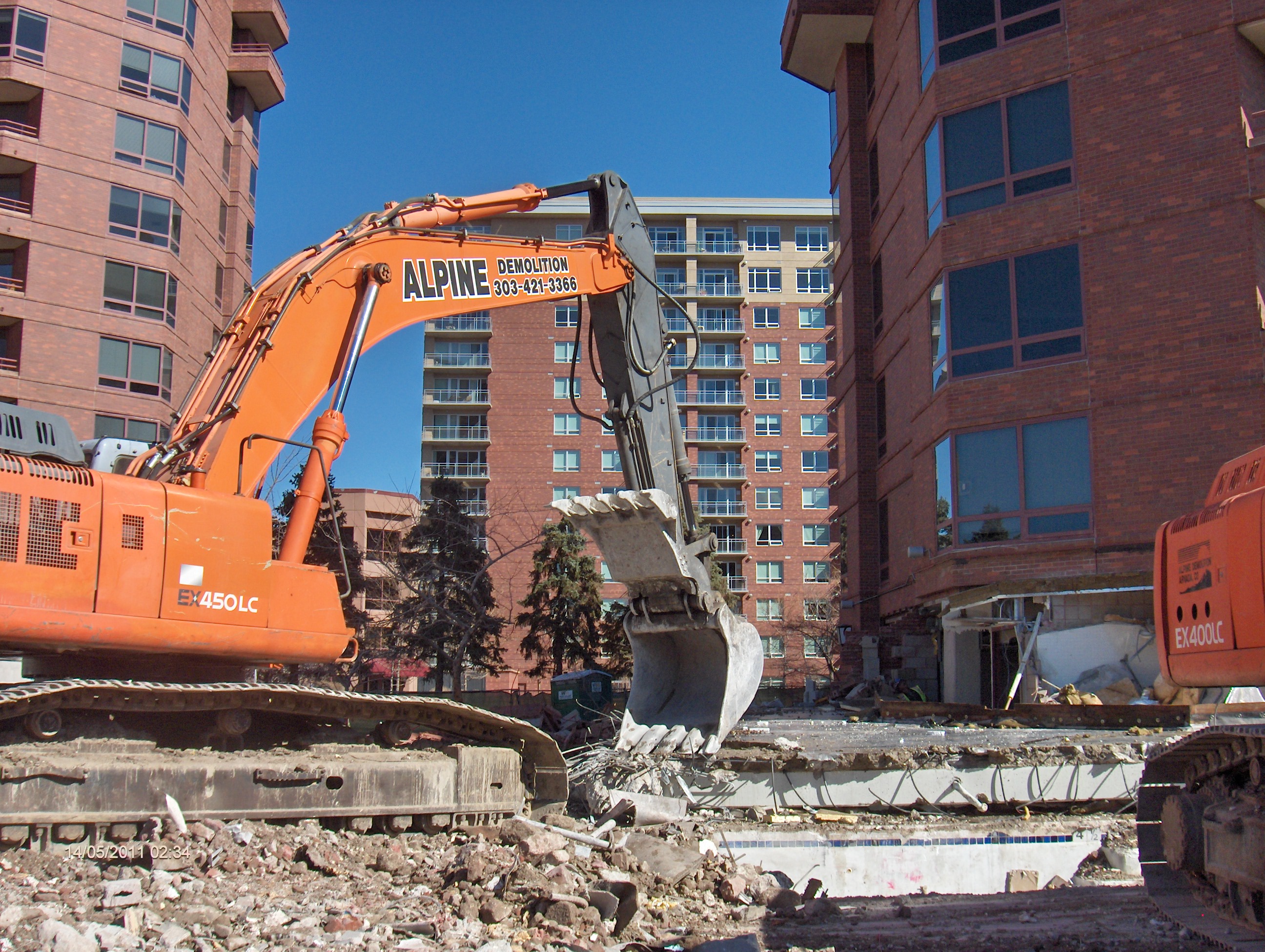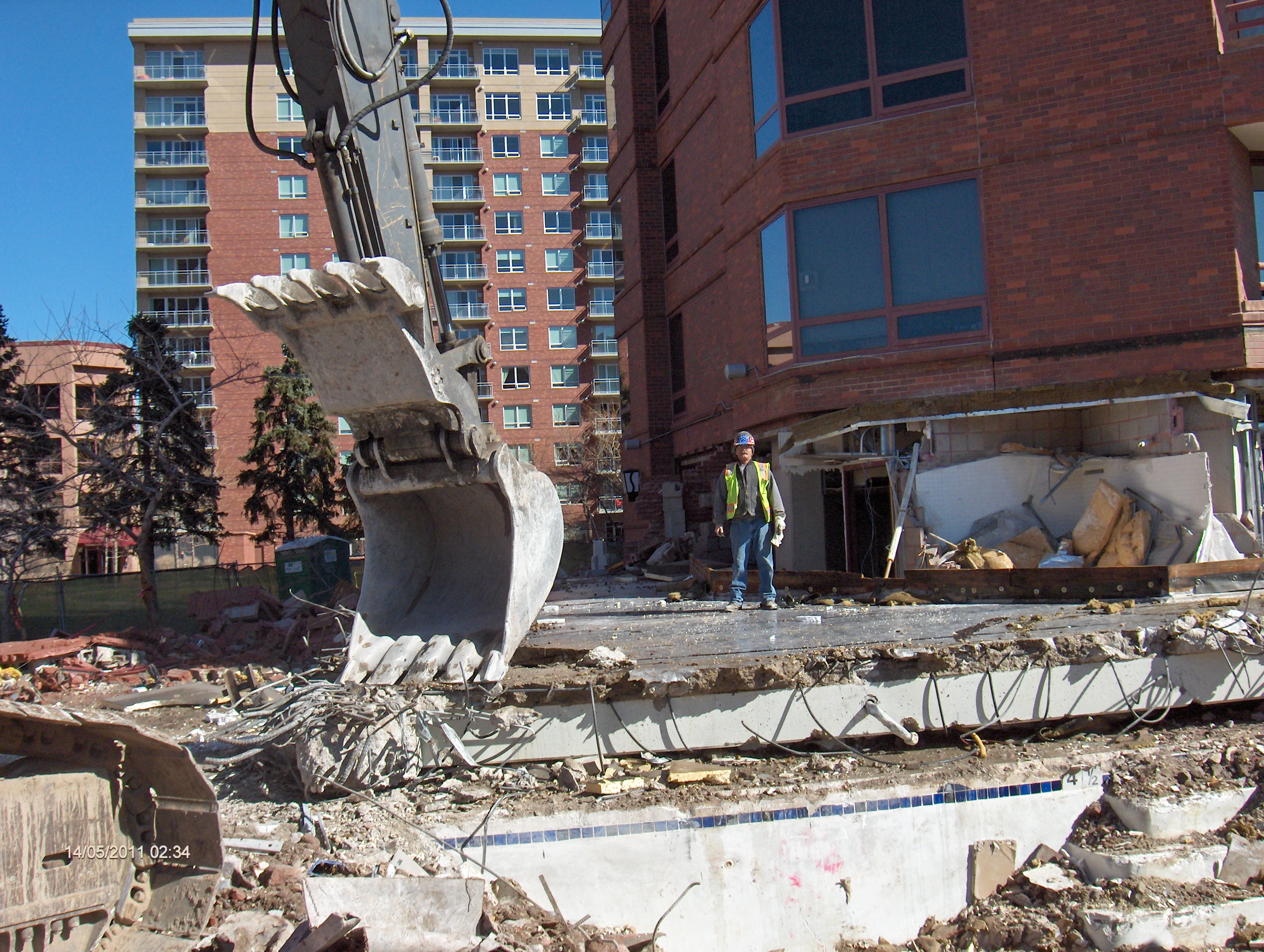 Alpine Demolition was hired to do the demolition, transportation, and disposal of existing one-story pool building and swimming pool as well as interior and exterior demolition at the ground floor of the existing tower north of grid line. Essentially Alpine was responsible for the removal of all hard surfaces including sidewalks. Alpine worked in difficult weather condition such as high winds and some snowfall but finished this project on time and within budget. Alpine had a 99% recycling rate on this project with the concrete and all the materials that we were able to salvage.